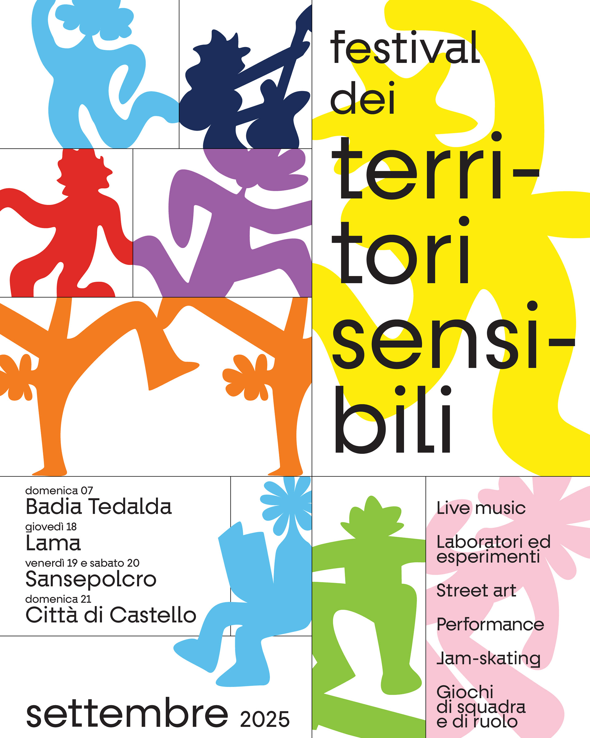 Later, I developed the graphics for one of the project’s key activities: Festival dei Territori Sensibili. For the festival, the abstract shapes of the main logo evolved into fluid human figures — characters that meet, collaborate, and create. This playful visual language turned the identity into a narrative: a community of individuals discovering, learning, and building together.